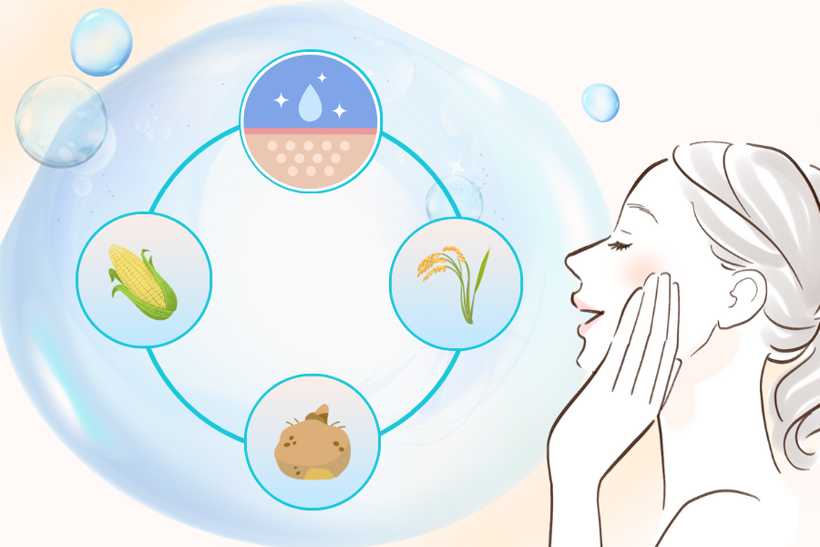 「米ぬか」「こんにゃく芋」「とうもろこし」から抽出され、保湿サプリメントにも利用されています。
