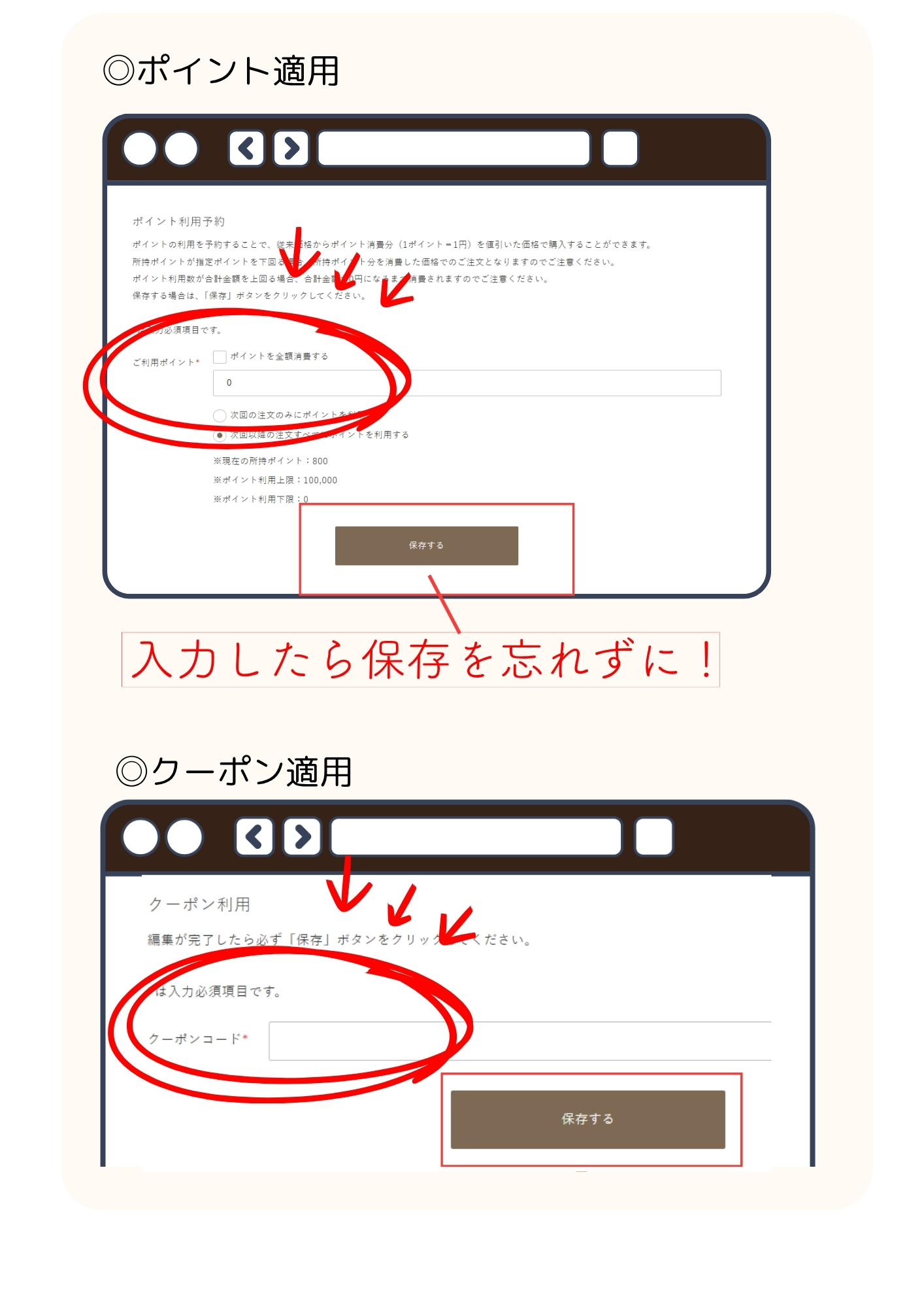 ポイント・クーポンそれぞれの利用欄に利用するポイントやクーポンコードを入力し保存する。