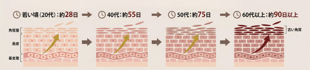 お掃除の間隔がどんどん長く: かつては約28日とされていたターンオーバーも、加齢に伴い遅くなる傾向があり、40代では約55日、50代では約75日、60代では約90日以上になるとする見方が一般的です(※あくまで目安であり個人差があります)。古い角質が肌に残り続け、ゴワつきやくすみの原因に。