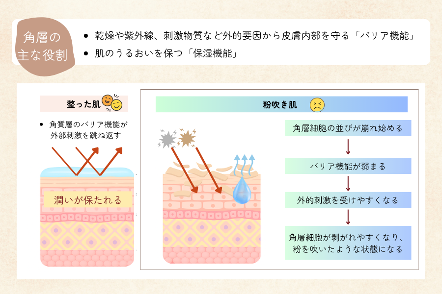 角層の水分や細胞間脂質(特にセラミド)が不足していると、角層はめくれやすくなり、粉吹き肌に直結します。まずはスキンケアで角層をしっかりと潤すことが必要です。