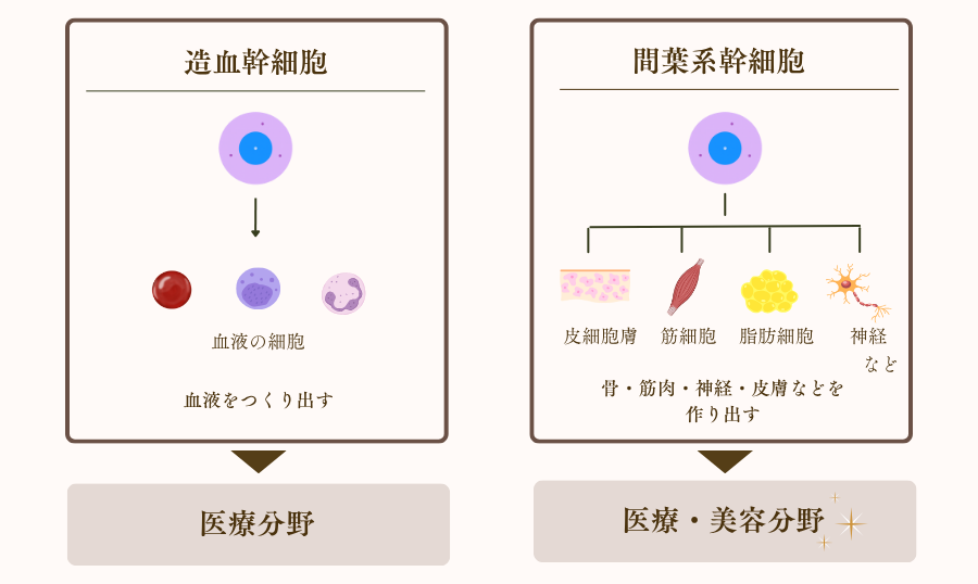 どちらも骨髄液で泉が湧くようにつくられますが、一般的な美容分野では 間葉系幹細胞が使われます。