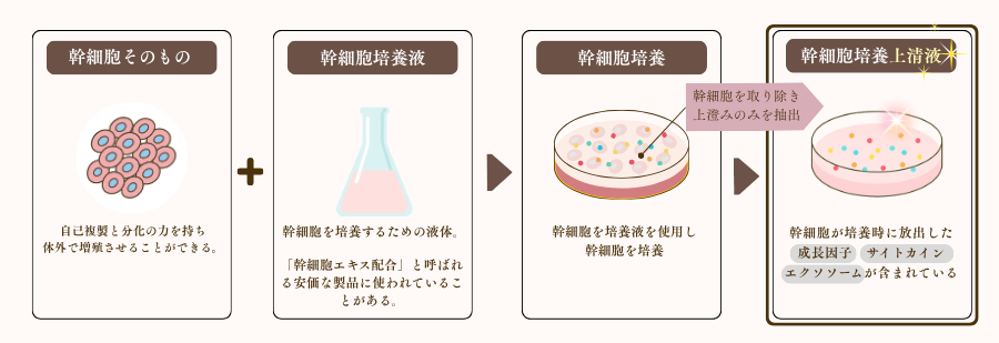 このうち、美容において特に注目されるのは③の「培養上清液」です。